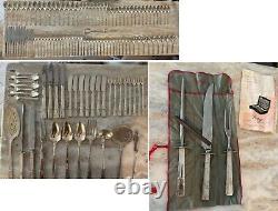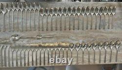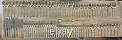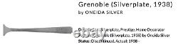 Huge Mixed lot set of 132 pieces. Grenoble (Silverplate, 1938) by Oneida Silver. 5 piece carving set, includes: sharpening stone, sharpening knife rod, carving knife and fork. 8 small knives - around 8 1/4. 8 knives - 9 1/4. 9 dinner forks - 7 5/8. 7 grille forks - 7 1/2. 15 salad forks - 6 1/2. 1 large pierced pie server.