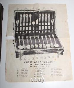 Vintage Silverplate Flatware Set of 50 pieces by Rogers Bros. Beautiful Silverplate Set in the Daffodil Pattern. Set comes with original cards and pamphlets and in the original wood case. Cheese Knife, Small Spoon, Soup Spoon, Serving Fork and Ladle.