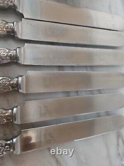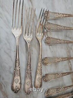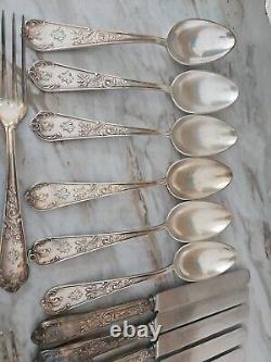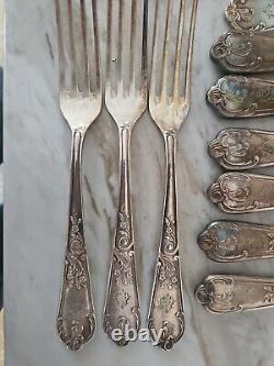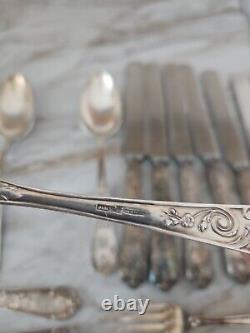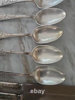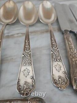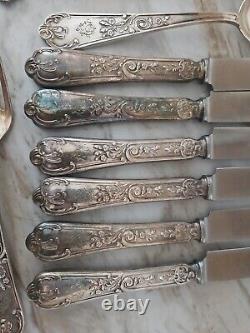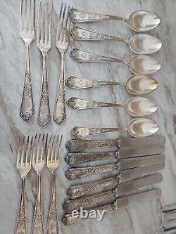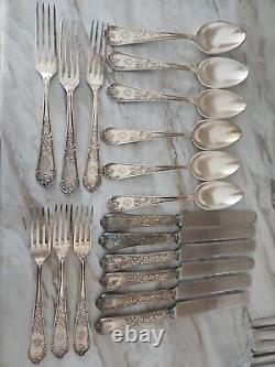 6 knives forks large spoons. All heavy pieces and ornately detailed. Some basic wear and tear or scratches to finish. This is an 18-piece silverplate flatware set from Spain by Meneses. The set includes forks, spoons, and knives, all featuring ornate and heavy designs.