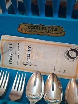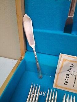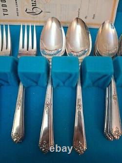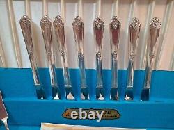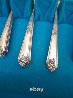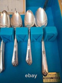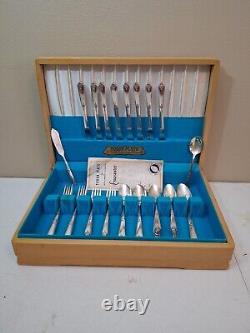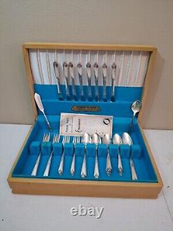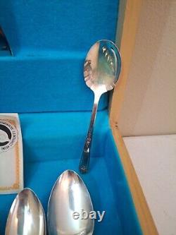 The sweet briar pattern, introduced in 1948, brings a touch of vintage charm to any table setting. Each piece is made of high-quality silverplate, ensuring durability and a lustrous finish that catches the eye. The set comes complete with a beautifully crafted wooden case, making it a perfect gift for collectors or a sophisticated addition to your own flatware collection.