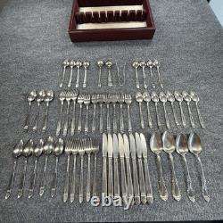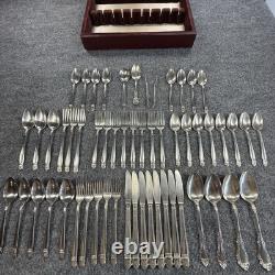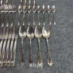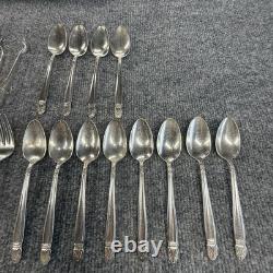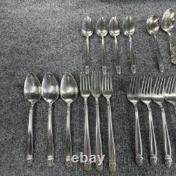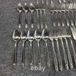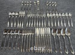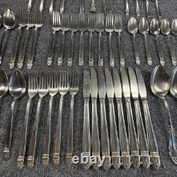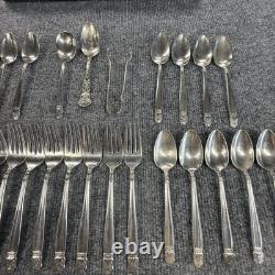 Vintage 55-piece flatware set - mostly Holmes & Edwards "Danish Princess". (49) Holmes & Edwards Inlaid I. "International Silver" silver plate pieces. (2) 1847 Rogers Bros A1 spoons. (1) 1904 souvenir spoon - Jefferson portrait, Palace of Horticulture, Lake Shore & Michigan Southern Railway.