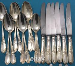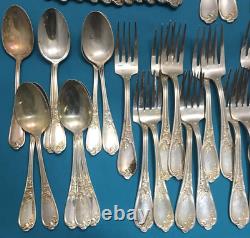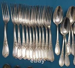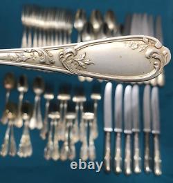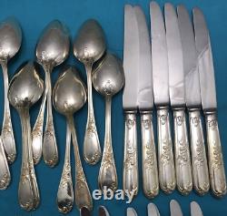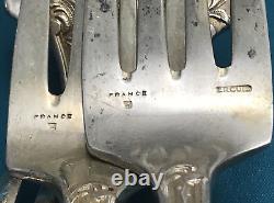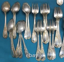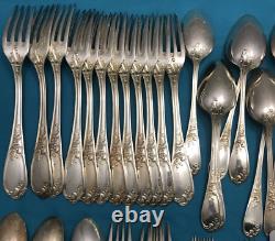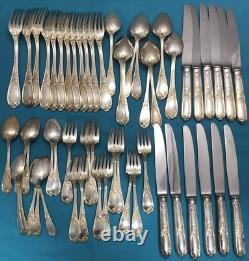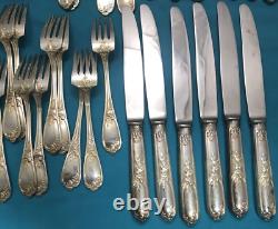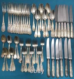 57 pieces of silverplated flatware set for a service for almost 12 - (3 pieces short) in the FONTENOY pattern by Ercuis France. Nice preowned condition with no damage, no plate loss, no monogram with typical use wear. These pieces have some toning and cloudiness and will need a quick polish. This is a pretty asymmetrical pattern with flowers and scrolls. 12 Dinner forks 8.25.