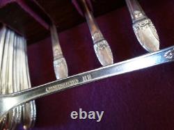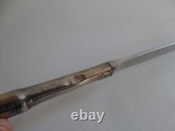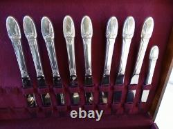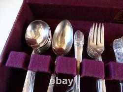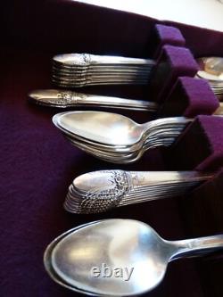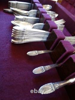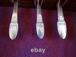 1 small dinner knife which has a couple dents in the handle. 8 soup / table spoons. Nice condition will need a polish.