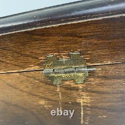 63 Pieces - Oneida Wm Rogers Silverplate Harmony 1938 Set In Wooden Box. Knives, two large spoons, one soup spoon, one cake server, one small round spoon, one large salad fork, one butter spreader, six tiny cake forks, 12 regular forks, six small forks, three big spoons, five medium spoons, 13 little spoons. The wooden box shows scratches around the outside, and on one of the two hinges the pin is out of one of its loops.