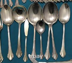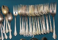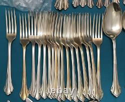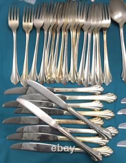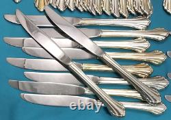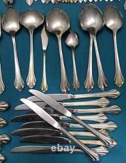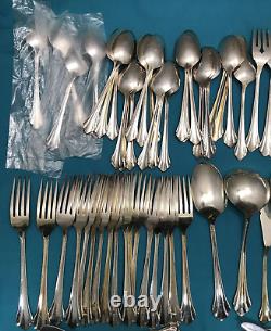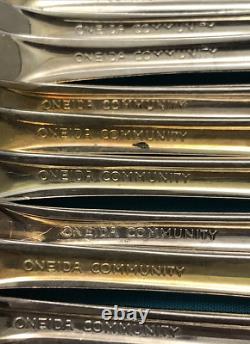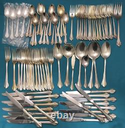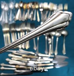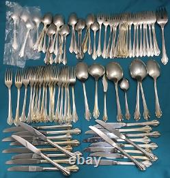 92 pieces of silverplated FLATWARE & SERVING PIECES in the 1980 SILVER CLARETTE pattern by Oneida Community. Very nice preowned condition with no damage, no plate loss, no monogram with light use wear. There are also 4 NOS teaspoons sealed in original plastic. This huge lot falls shy of a complete set as there are no place / soup spoons, but would make a great service for 16 with 4-piece place settings (dinner & salad fork teaspoon & dinner knife). Nice and bright, you can see my reflection in the spoon bowls, those aren't dark spots!