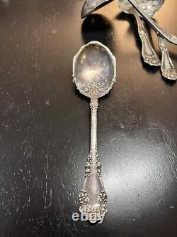 12 knives, 9 long, Holmes & Edwards marked on blade, all engraved with initial (I'm assuming). 12 forks, 7 long, engraved, Holmes & Edwards XIV on back of handle, there is another marker in front of name but hard to make out. 12 soup spoons, 7 long, Olnhausen & Smith XIV on back of handle, engraved. 11 spoons, 6 long, Olnhausen & Smith on back of handle, engraved.Ladle, 7" long, matches flatware, bowl is about 2.25" wide, Holmes & Edwards XIV on back of handle, engraved. Ladle, 6" long, matches flatware, bowl is 1.75" wide, Holmes & Edwards XIV on back of handle, engraved. Olnhausen & Smith on back of handle, 6 long, engraved.