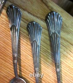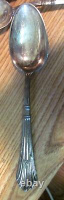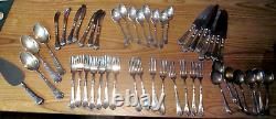 This Gorham "Churchill" silver plate flatware set includes 8 place settings. The handles have a romance pattern and the set is dishwasher safe. Made in the United States, this silverware is perfect for all occasions. Includes: 8 dinner forks, 8 teaspoons, 8 soup spoons, 8 butter knives, 8 cheese/butter knives, 7 fish forks, 3 serving spoons, 1 cheese/cake spatula.