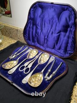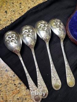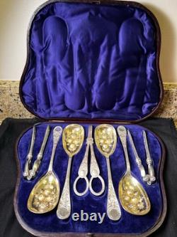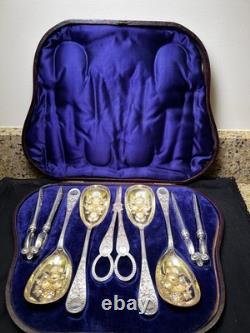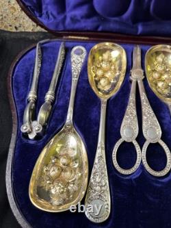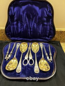 This antique Martin Hall silverplate dessert serving set features a Victorian style with a berries pattern on the spoons. It comes in a wood case for easy storage and display. The set includes various pieces of silverplated flatware, perfect for serving desserts or appetizers in a charming and elegant manner. Ideal for collectors of antique silver or those looking to add a touch of vintage sophistication to their dining experience.
