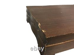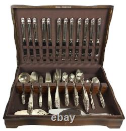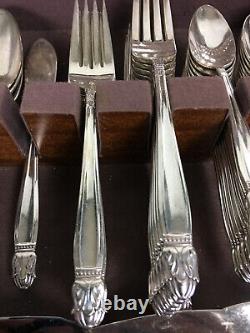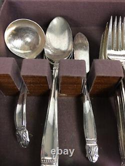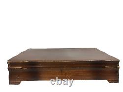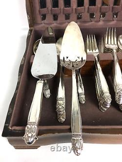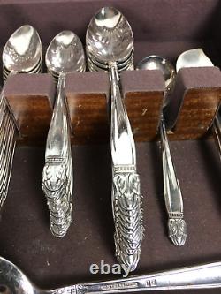 3 TABLE SPOONS SERVICE SPOONS. This set comes in a Free vintage Homes and Edwards storage box in fair condition with some wood veneer splitting scuffs and scratches.