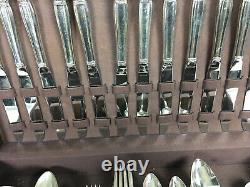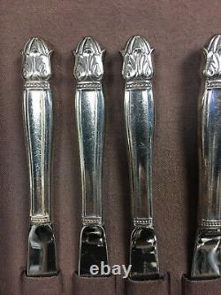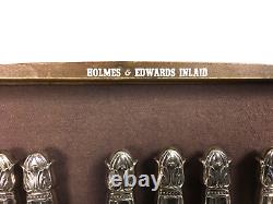 12 DESSERT / PLACE (table or soup) SPOONS. 1 DROP HOLLOW HANDLE PIE SERVER. 1 PIERCED FLAT HANDLE PIE SERVER. 1 FLAT HANDLE BUTTER SPREADER. 1 GRAVY LADLE CURVED HANDLE.