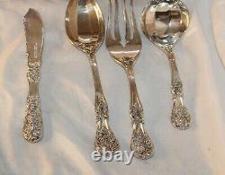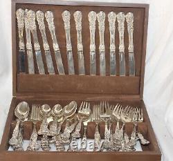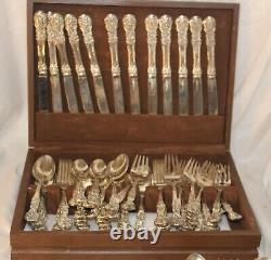Up for sale we have an FB Rogers FRENCH ROSE SILVERPLATE FLATWARE Set with 12-5 Piece Place Settings, a 4 pc Hostess Set & wooden Box. The bottom of the wood is loose/broken off, The flatware has some light scratches and general wear as seen in photos.