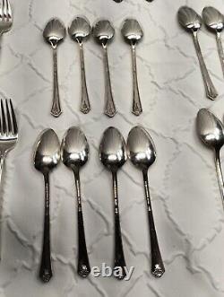 The Holmes & Edwards Inlaid IS Silver Plate Spring Garden Flatware Set is a 52-piece collection of Art Deco style silverplated flatware. This post-1940 set features the Spring Garden pattern, showcasing intricate floral designs on each piece.