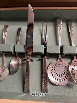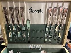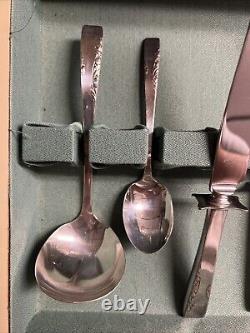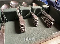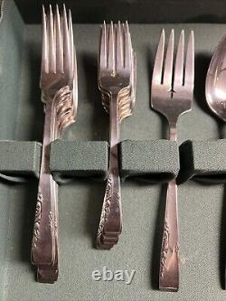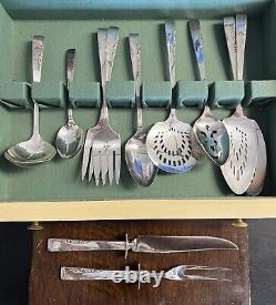 1881 Rogers Oneida Proposal Silverplate Flatware Set with box. 60 pieces total in very nice condition. Includes 8 place settings and several serving utensils. The six main spoons, forks, and knives all have 8 matching pieces for a total of 48, plus the one small butter server. The remaining 11 pieces are all large serving utensils. See Pictures for more details as those are the exact items you will receive.