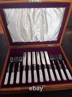 Crafted with an eye for elegance, this Mother of Pearl Knives/Fork Set by Henry Rogers, Sons & Co Sheffield is a testament to classic design and fine craftsmanship. Each piece showcases the iridescence of Mother of Pearl material paired with the timeless appeal of silver plate, bringing a touch of sophistication to any dining setting. The intricate pattern cascades along the length of the cutlery, a true reflection of the skillful artisanship from the renowned maker, Henry Rogers, Sons & Co. Add a piece of history to your tableware collection with this exquisite flatware set.