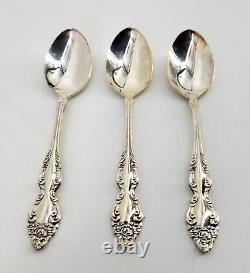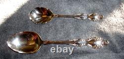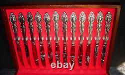 8 hollow handle dinner knives 9 inches. 8 steak knives 9 inches. 8 dinner forks 7 & 1/4 inches. 8 oval soup spoons 6 & 3/4 inches long. 8 salad / dessert forks 6 & 3/8ths inches. 16 teaspoons - 6 inches. 1 solid serving tablespoons 8 1/8th inches. 1 slotted serving spoon 8 1/8th inches. 1 large salad / casserole serving spoon 8 5/8ths inches. 1 large casserole / salad serving fork 8 3/8ths inches. 1 gravy / sauce ladle 6 3/4 inches. 1 sugar / condiment spoons 6 inches.1 master butter knives 6 & 3/4 inches. Most of my sets are estate finds. Although well cared for vintage treasures, I never imply brand new. Some days we are very busy looking for more treasures or working, so please allow a couple of days for an answer to any of your questions.