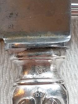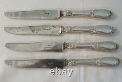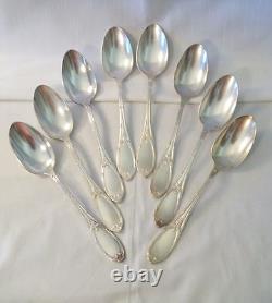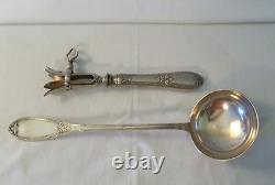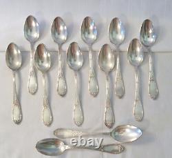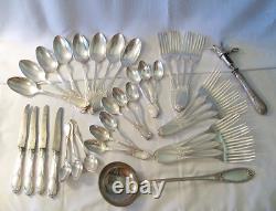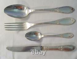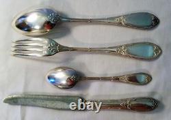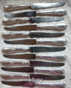Fair to Good condition, with some wear as expected for age, with the. EXCEPTION of the luncheon knives and two teaspoons. All eight of the luncheon knives are tarnished as the four shown in the photo, the other four need repair (the blade is loose or detached from the handle). Ten teaspoons are great, two have rough edges on the bowl rim. I would gladly answer any questions you may have. 8 Luncheon/Youth knife (8.25). 12 Dinner Fork (8.5). 1 Bone Holder (8.5). 12 Oval place teaspoon (5.75).1 Ladle, 3.5" bowl (13.5").