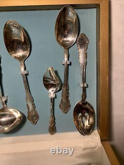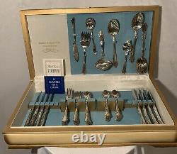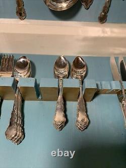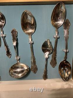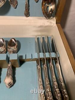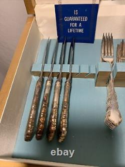 Is little handle on the case lid itself. May have the tip broken off. 8 knives 8 large spoons 16 small spoons 8 small forks 8 large forks and 8 serving pieces.