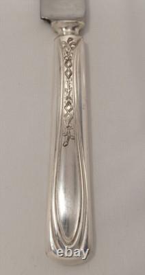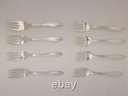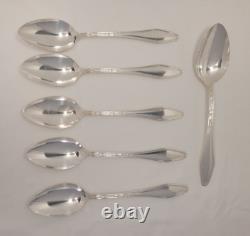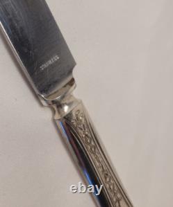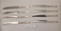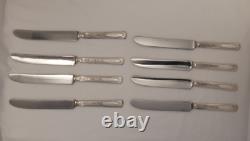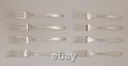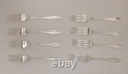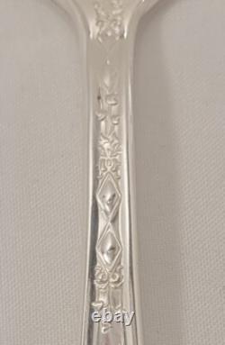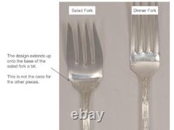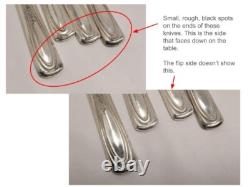 Vintage Old Company Silverplate Flatware 50 Pieces (Place Setting of 4 pieces each for 8 + 18 Extras). Very classy design, detailed at the center of the pieces without being too ornate. Most of the pieces are from Old Company Plate Plus. The exception is the salad forks which are from Brooklawn Plate. The design is the same except the pattern extends up onto base of the salad fork bowl a bit. 18 teaspoons plenty for tea and coffee after dinner! Serving Spoons = 8.25. Sugar Spoon = 6.125. Butter Knife = 7.125. There are light surface scratches, typical of use. The knives are a bit darkened where the stainless blade blends with the handle (see second-to-last photo) and about half of the knives have some small, rough, black spots on the handle ends on the table-facing side (see last photo).
