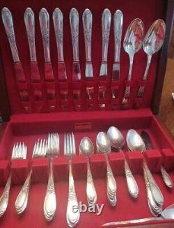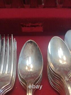 8 place setting, 52 pieces. Original wood, velvet-lined box with minimal scratches.